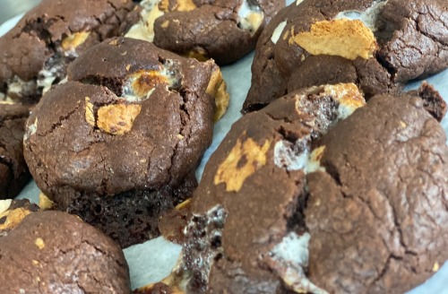 INGREDIENTS: Unbleached All Purpose Flour [Unbleached Enriched Hard Wheat Flour, Niacin (Vitamin B3), Reduced Iron, Thiamin Mononitrate (Vitamin B1), Riboflavin (Vitamin B2), Folic Acid)], Pure Cane Sugar, Honey/plain Cookie, Unsalted Sweet Cream Butter, Dark Chocolate [Sugar, Chocolate Liquor, Cocoa Butter, Dextrose, Soy Lecithin, Vanillin], Egg, Mini Marshmallows [Corn Syrup, Sugar, Modified Corn Starch, Water, Contains 2% or less of: Gelatin, Natural & Artificial Flavor, Tetrasodium Pyrophosphate, Color (Blue 1)], Cocoa Powder (Milk), Smart Balance, Select Blend Of Oils [Blend of vegetable oils (Soybean, canola, and olive oils)], Vanilla Extract [Vanilla Bean Extractives in Water & Alcohol], Baking Soda [Sodium Bicarbonate], Salt